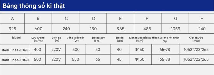 Model KXX-TH50S: Lưu lượng gió 500 m³/h, công suất 180W, trọng lượng 65–78kg, kích thước 1180×722×265mm.