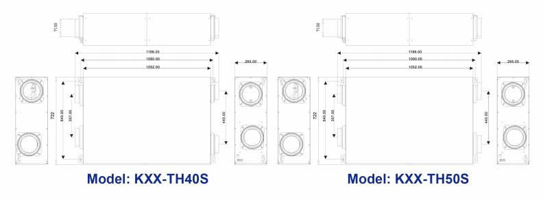 Model KXX-TH40S: Lưu lượng gió 400 m³/h, công suất 140W, trọng lượng 65–78kg, kích thước 1052×722×265mm.
